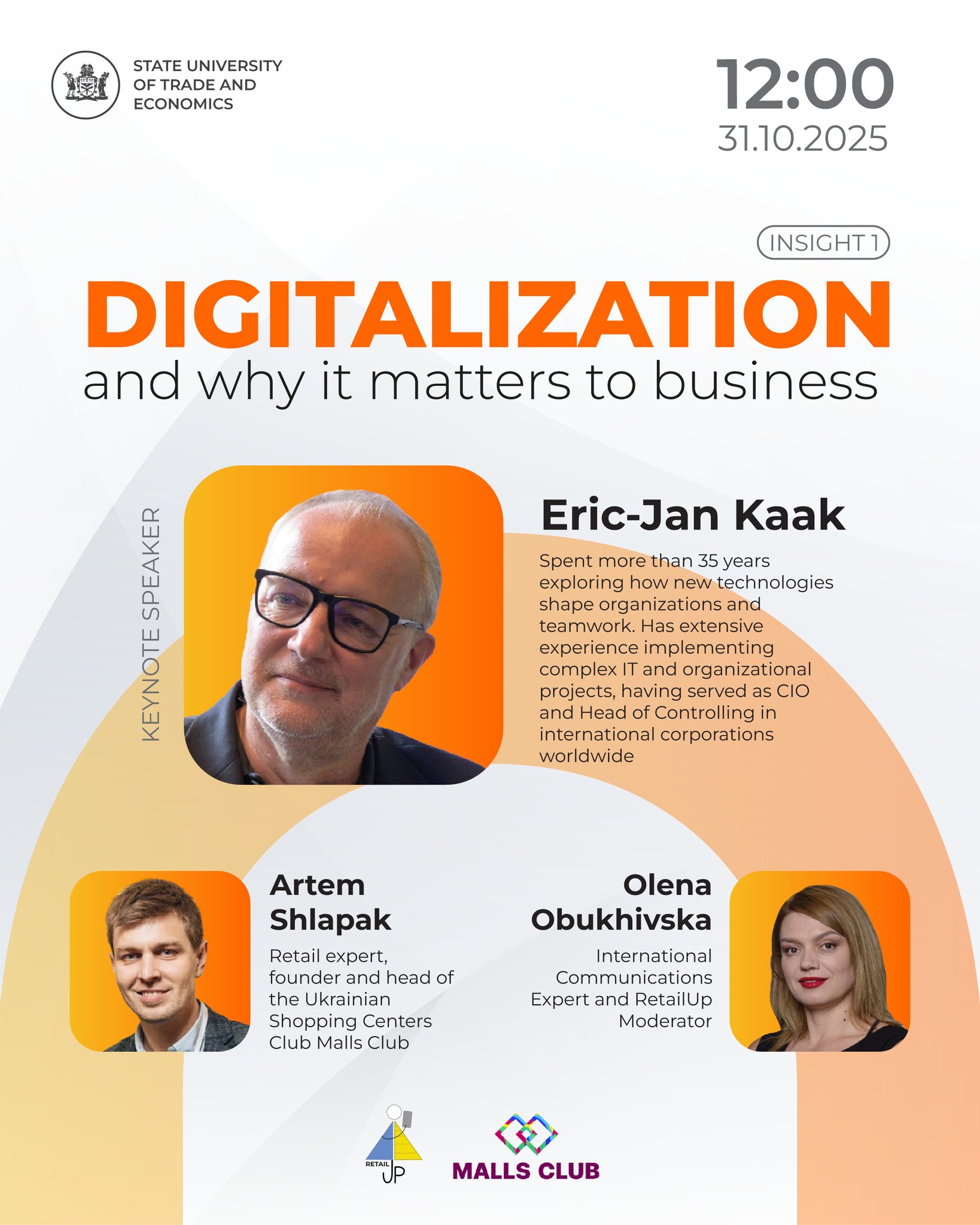 RetailUp — нова інтелектуальна ініціатива, запущена під натхненним гаслом «Where ideas meet experience» («Де ідеї зустрічаються з досвідом»). Вона покликана створити міст між Державним торговельно-економічним університетом, українським бізнесом та європейською бізнес-спільнотою, забезпечуючи практичні інсайти та прямий діалог із провідними експертами галузі.