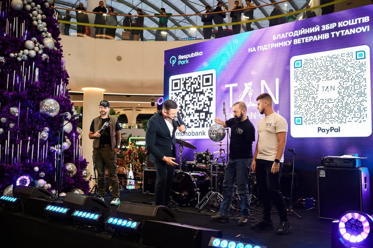 В столичному ТРЦ Respublika Park святково відкрили головну ялинку. Подія стала частиною великого благодійного збору коштів для фонду TYTANOVI на реабілітацію, імпланти та операції для ветеранів.