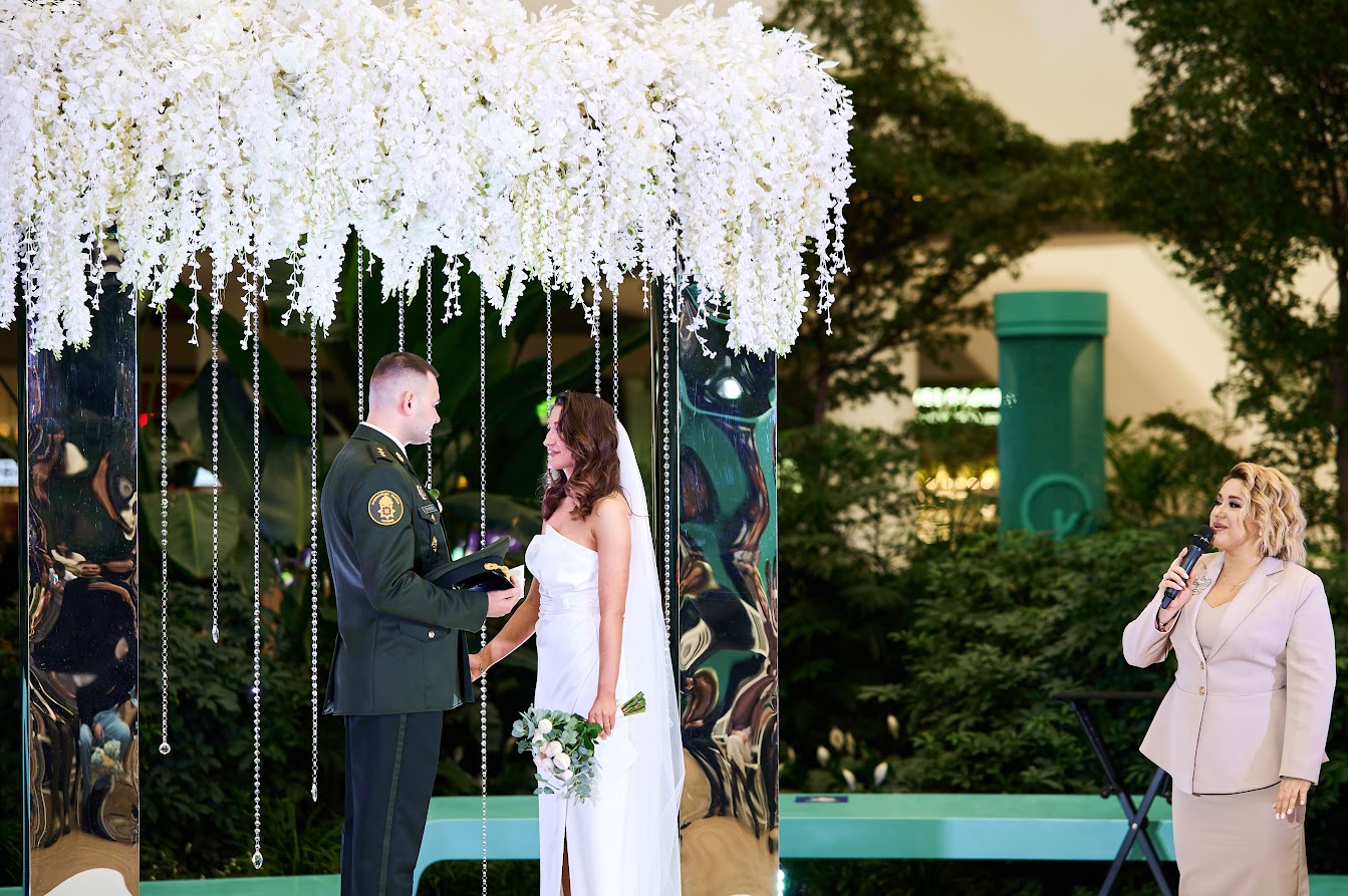 Унікальна весільна церемонія для українських захисників відбулася в минулу суботу у найбільшому торгово-розважальному центрі Києва Respublikа Pаrk. Одразу шлюб взяли п’ять пар. Усі наречені нацгвардійці – в парадних одностроях, їхні другі половинки – у вишуканих весільних сукнях. Гості не лише рідні та друзі наречених, а й відвідувачі закладу.